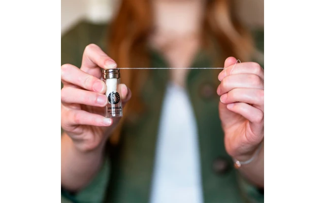 - Praktisch: 30 Meter vegane und plastikfreie Zahnseide für unterwegs und zu Hause – im handlichen und stylischen Glasflakon, der in jede Hosentasche und Handtasche passt.