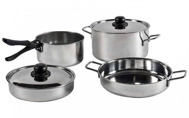 Leichtes Topfset aus hochwertigem Edelstahl. Platzsparend ineinander stapelbar. Lieferung inkl. Griff und Verschlussgurt.