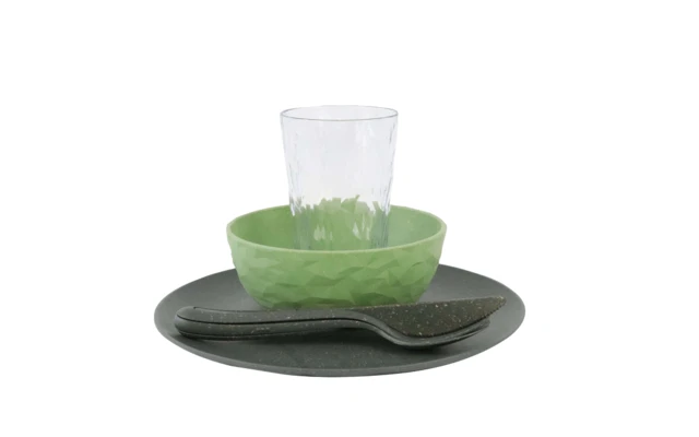 Set bestehend aus: 1x Besteck-Set KLIKK, 1x Glas (Becher) 400ml CLUB L, 1x Schale 700ml CLUB BOWL, 1x Flacher Teller 260mm CLUB