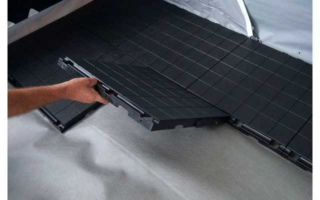 Hält man sich viel in seinem Vorzelt auf, so ist es angenehm, wenn der Boden eben ist und der Teppich glatt liegt. IsabellaFloor bietet zahlreiche Vorteile. Er ist ohne Werkzeuge leicht auszulegen, da die Elemente mit Verschlusszapfen und wie ein Stecksystem ineinander gesteckt werden. Er ist leicht aufzubewahren und hat eine hohe Lebensdauer. IsabellaFloor hat außerdem den Vorzug, dass man Schrägen und Eckschrägen zukaufen kann. Das ergibt nicht nur ein ansprechendes Finish, sondern ist auch praktisch z. B. für Rollstuhlfahrer und Familien mit Kinderwagen.