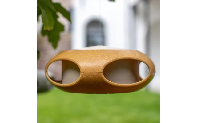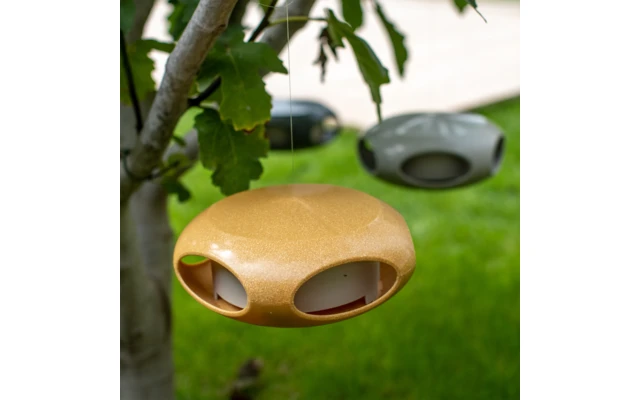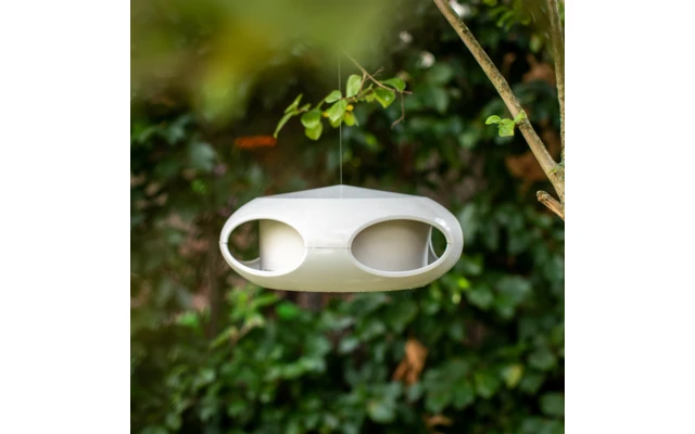 Birds go outer space, ist eine neue Generation der Vogelfutterhäuschen. Ein moderner Flugkörper, bei dessen Entwicklung auf eine ornithologisch korrekte Fütterung geachtet wurde. Das Futtersilo im Herzen des Raumschiffs verhindert, dass seine Passagiere auf dem Essen herumhüpfen und es verunreinigen. Wir wünschen guten Flug!