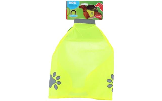 Reflektierende Weste für Hunde in neongrüner Signalfarbe und mit Reflexmaterial. Die Weste wird über den Rücken gelegt und mit Klettbändern um die Brust und um den Hals befestigt.
